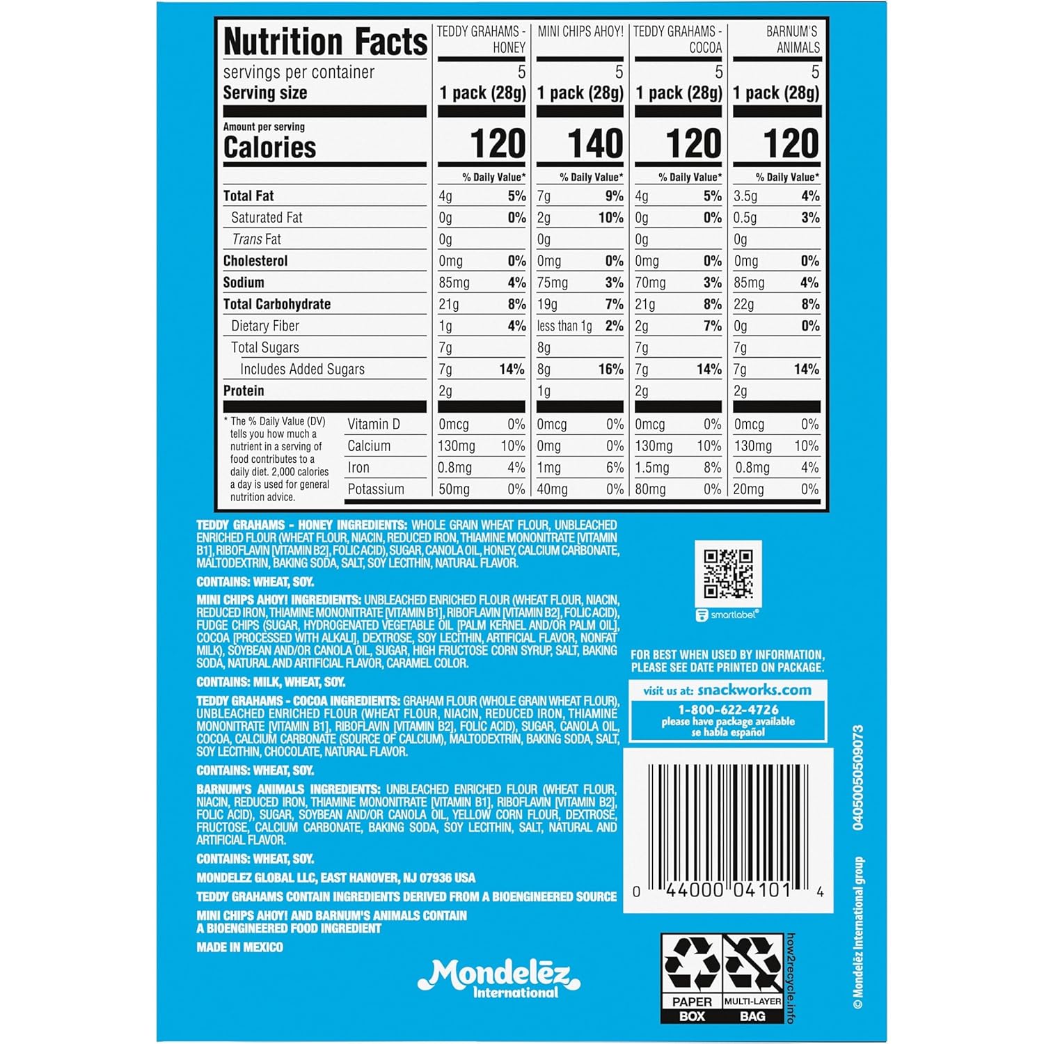Nabisco Fun Shapes Variety Pack includes Barnum's Animal Crackers, CHIPS AHOY! Mini cookies and Teddy Grahams in both honey and chocolate for easy, grab-and-go nibbling. Make your office or school lunch special with snack packs of classic crackers, chocolate graham crackers or mini chocolate chip cookies. This snack box includes 20 individually packaged assorted cookie snack packs for easy storage and convenient transport making them easy on the go snacks.