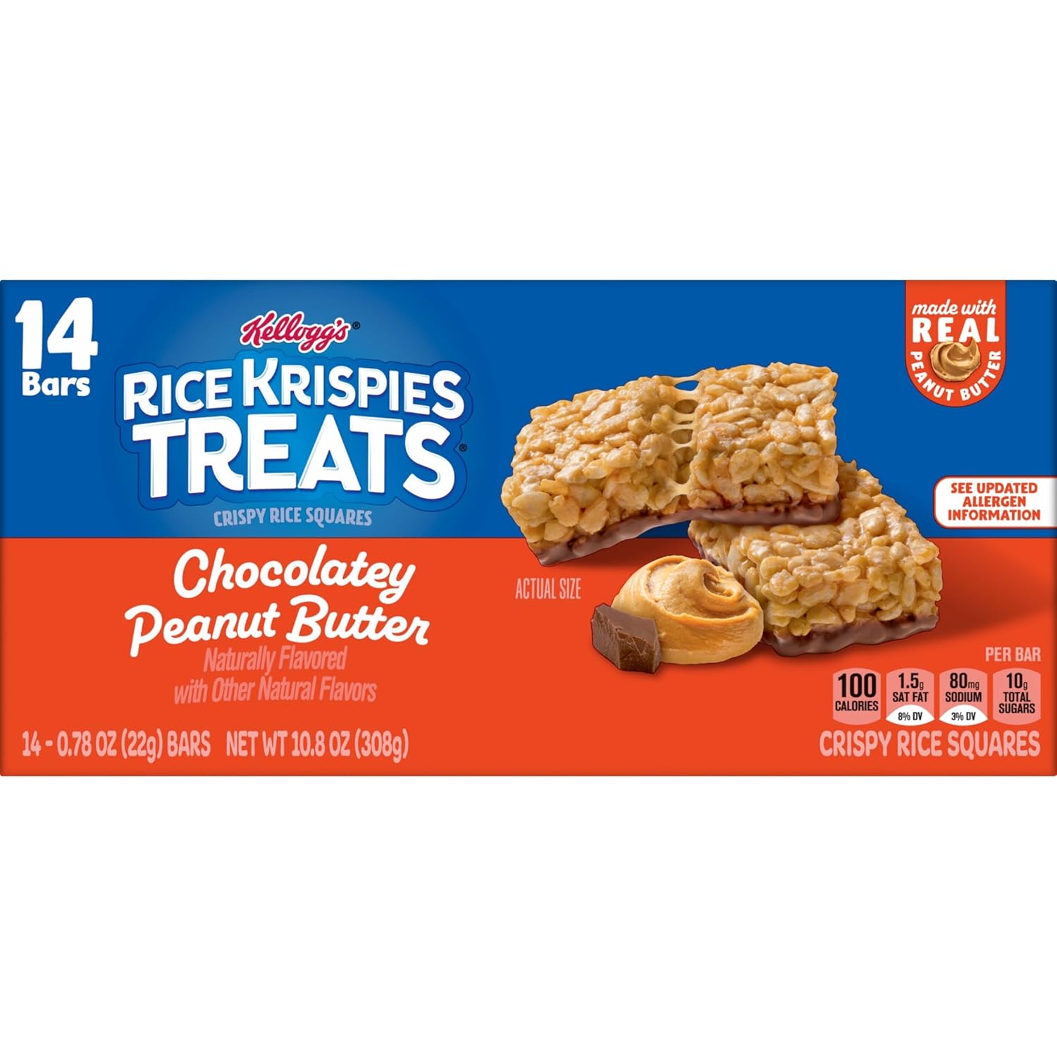 Rice Krispies Treats Crispy Rice Squares, Snack Bars, Chocolatey Peanut Butter, 10.8oz Box (14 Count)