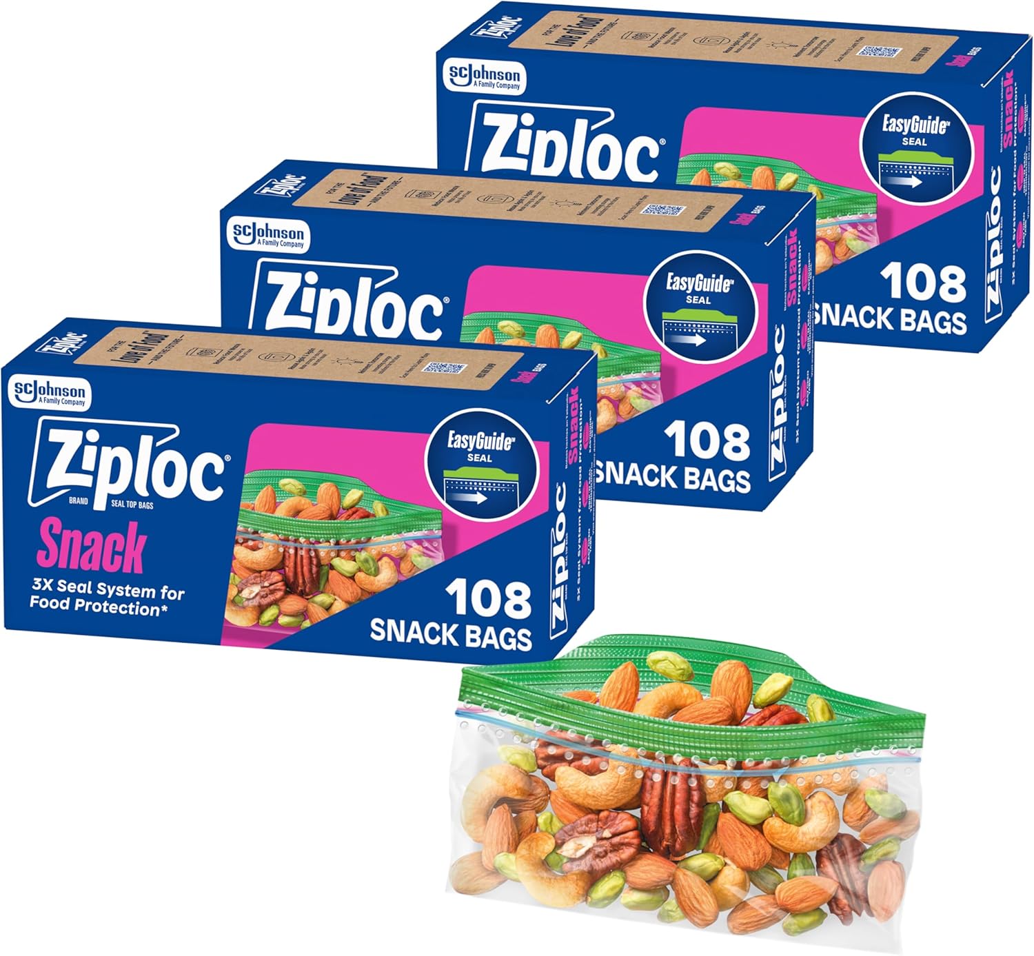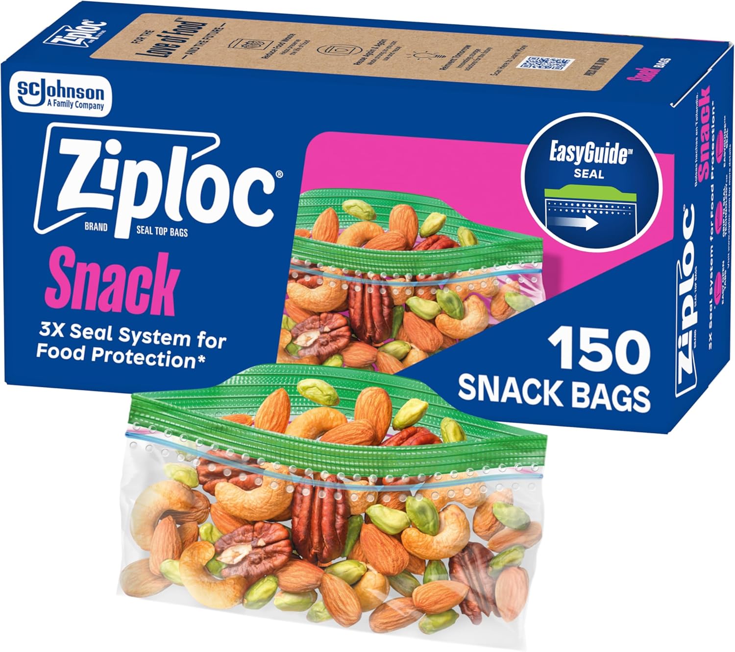 Ziploc Snack Bags with EasyGuide Texture, Small Plastic Storage Bags with Grip ‘N Seal Technology, 50 Bags Total (Packaging May Vary)